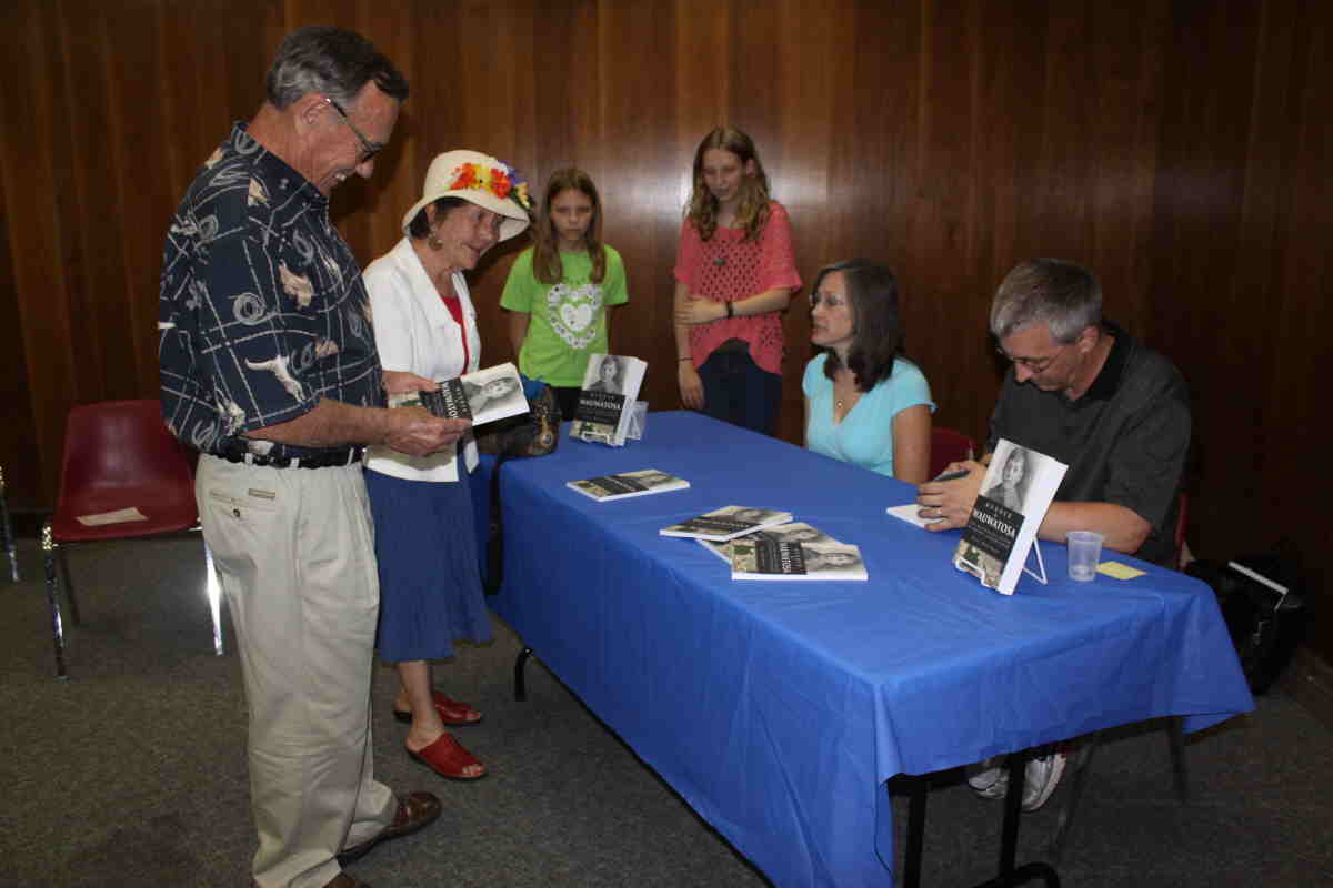 Erv and Lou Ellen Watts get a book from Paul Hoffman at the Edinburgh Wright-Hagemann Public Library in Edinburgh, Indiana, on July 11, 2012. With the author are his daughters, Emily and Kirsten, and his wife, Kimberly. Photo by Kami Ervin