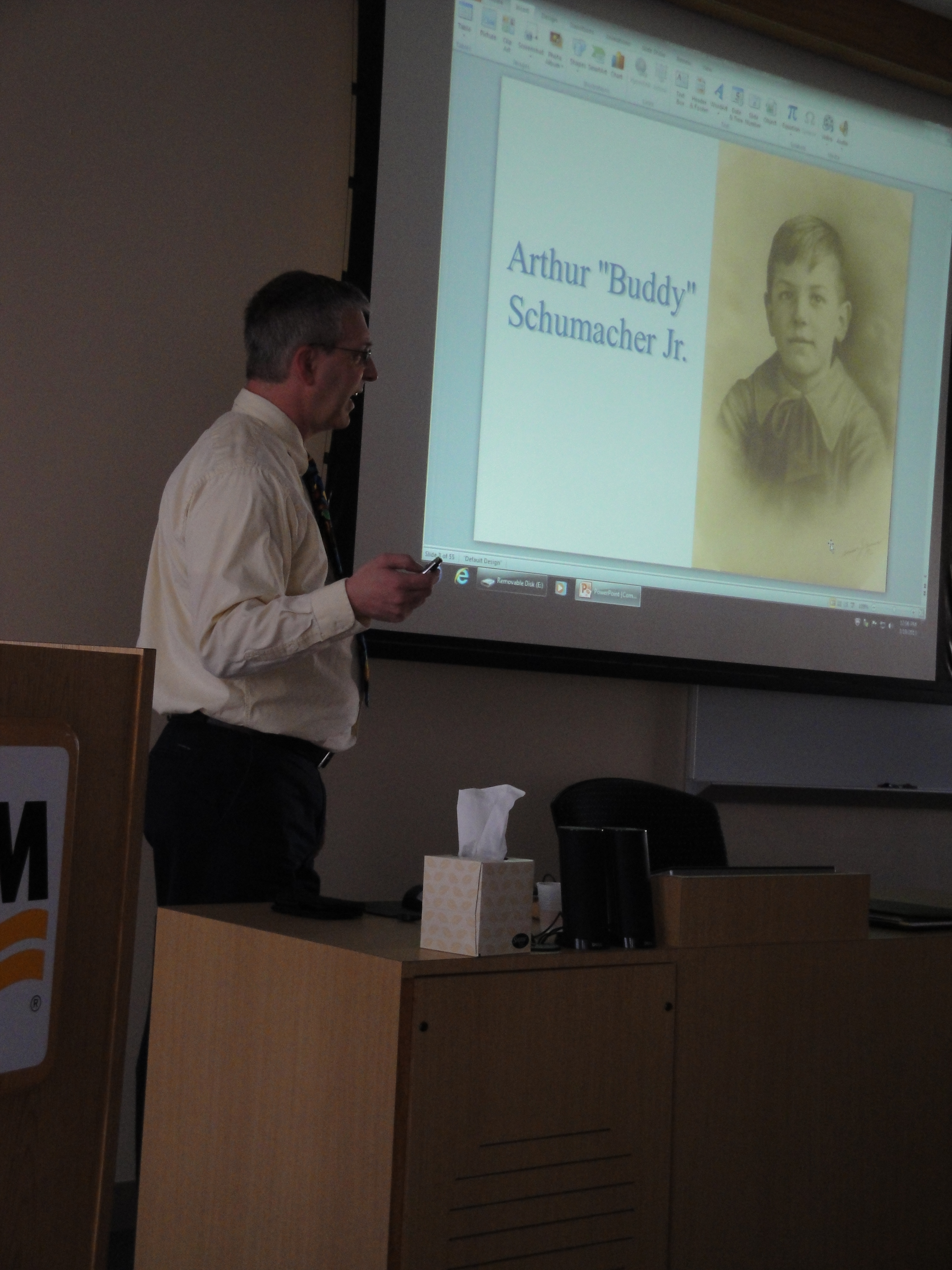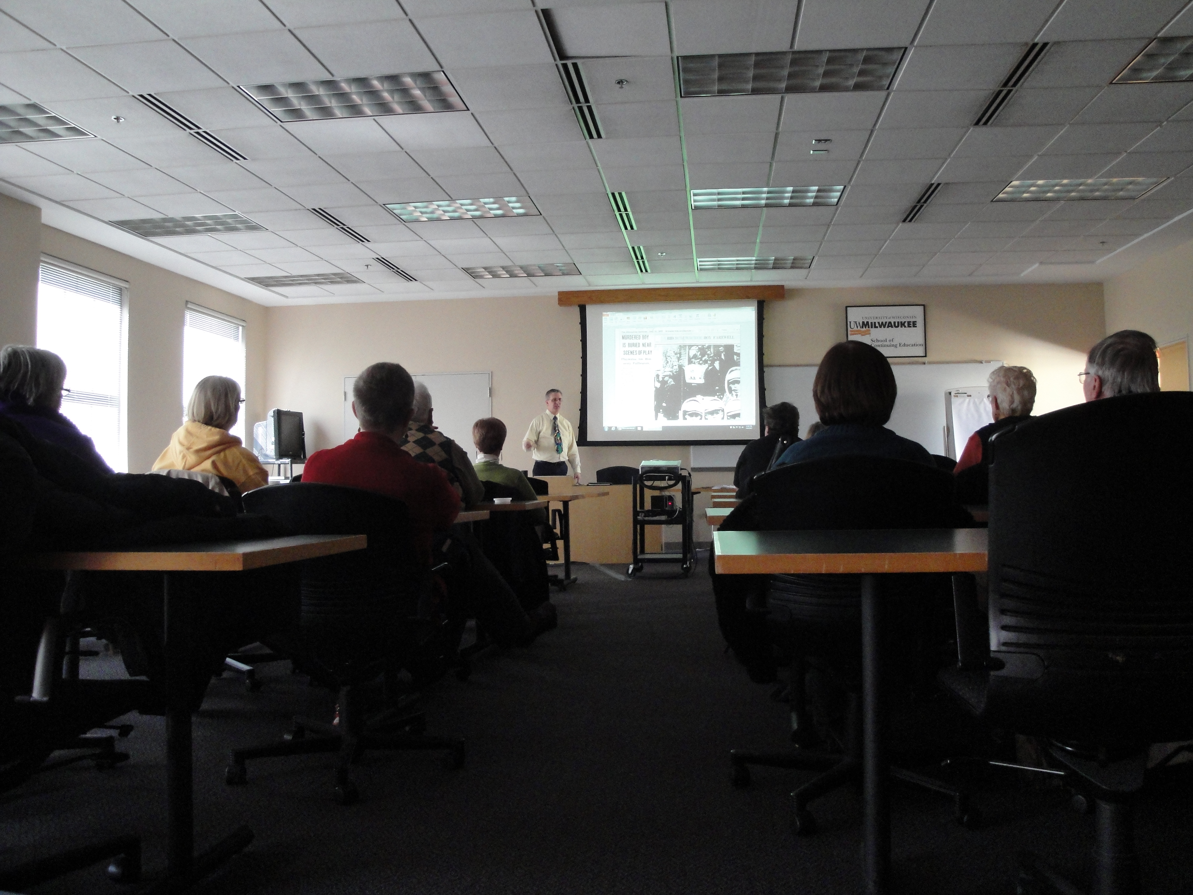 I had the priviledge to present the story of Buddy Schumacher at a University of Wisconsin – Milwaukee Osher (ages 50+) program in downtown Milwaukee on Tuesday, March 19. My wife was kind enough to take a few photos. Thanks to everybody who came. I had a great time!