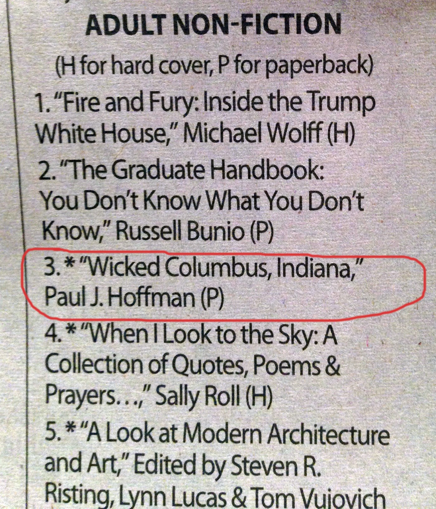 “Wicked Columbus, Indiana” is at No. 3 on the Viewpoint Books adult nonfiction list. My most recent book has been on the Viewpoint best-seller list for just about every week since it was published last June.