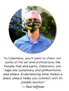 - I managed to get into a local, high-end, glossy magazine recently. And with my Packers mask on! Columbus magazine, a publication I once served as editor for, has a feature each issue where they ask “the man, woman, or child on the street” a question. The people whose answers they chose to print have their photos run along with their brilliant quote. For the September/October issue, we all wore masks and the photographer (Carla Clark) took our photos from a minimum of six feet away. Carla was 8 feet, 4.6 inches away from me when she took my photo in my front yard. I calculated that distance based on the position of the sun at that moment and the length of our shadows (God, I love science). Our question was “What advice would you give to someone who has recently moved to Columbus?” My answer is in the photo posted herein.