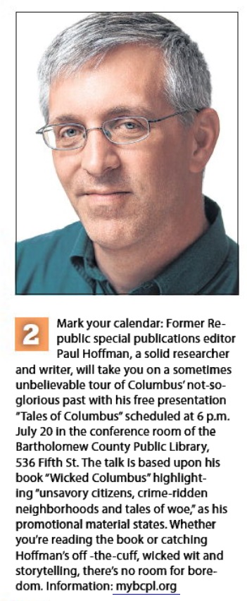 In last Thursday’s edition of my local newspaper, Brian picked my July 20 presentation on my book, Wicked Columbus, Indiana at the Bartholomew County Public Library as his second pick for stuff to do in and around Columbus in the next few weeks.