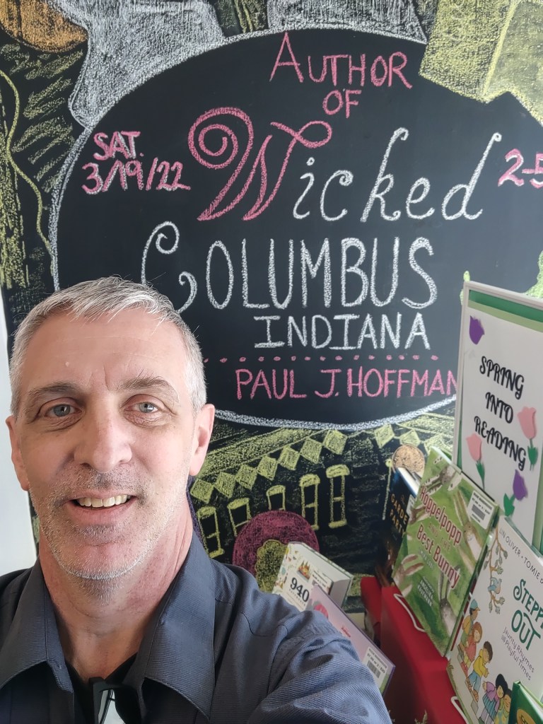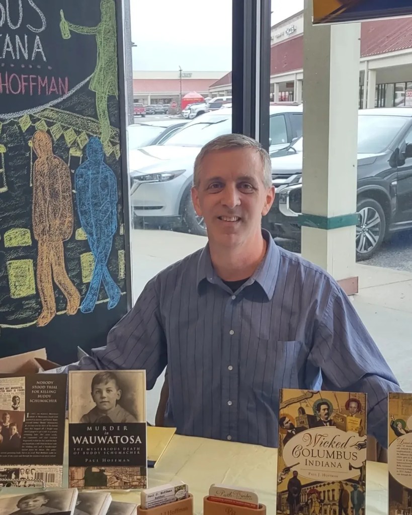I met lots of interesting people, sold some copies of my books, Wicked Columbus, Indiana, and Murder in Wauwatosa: The Mysterious Death of Buddy Schumacher, made a young lad’s day by adding to his collection of autographs by authors, and ate Indiana-shaped cookies that were really tasty. Oh, and I sold a copy of my wife, Kimberly S. Hoffman‘s book, The Red Coat: Giving and Gratitude During The Great Depression even though she couldn’t be there due to illness.