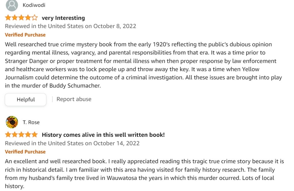 My first book, Murder in Wauwatosa: The Mysterious Death of Buddy Schumacher, has been out since June 2012. I rarely check out reviews anymore, but happened upon the Amazon page for the book earlier this month. Staring me right in the face were two new really nice reviews that had been posted within the two weeks previous. That was a nice surprise.