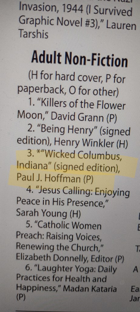 My second book, Wicked, Columbus, Indiana, has had another resurgence and has been on the Viewpoint Books bestseller list the past month or two. This week’s listings, published on Saturdays in The Republic newspaper, have it at Number 3 in the adult nonfiction list. That’s awesome!