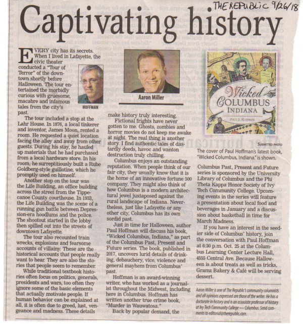 I'm eagerly looking forward to presenting a program on my book, "Wicked Columbus, Indiana" at Ivy Tech Community College in Columbus, Indiana, on Oct. 25. My presentation is part of the annual Columbus Past, Present & Future program that the school puts on. "Wicked Columbus" will be the Past part of the series. Programs later... Continue Reading →