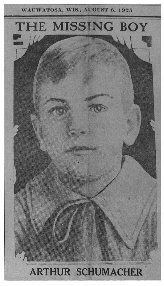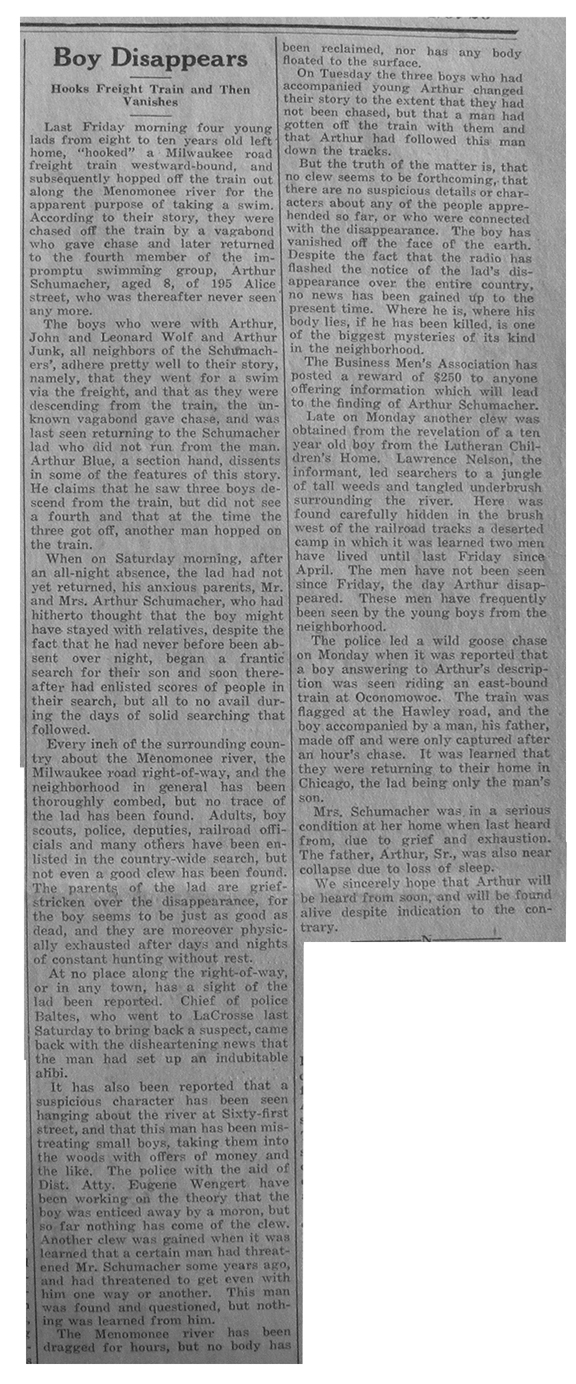 Wauwatosa News story announcing the disappearance of Buddy Schumacher (thanks to Larry Widen for taking this photo).