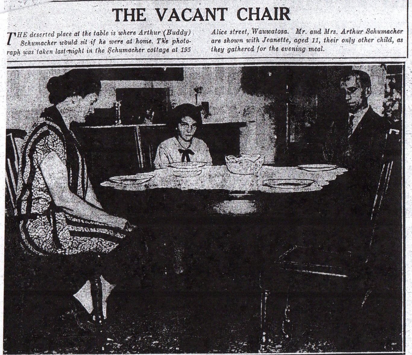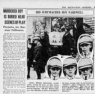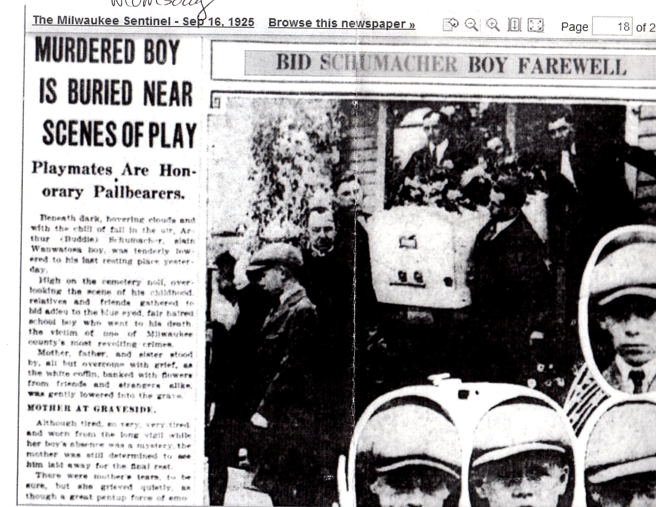 The first newspaper article I ever saw regarding the death of Buddy Schumacher. That’s his coffin being carried out of his house on Alice Street (now 74th Street) just north of State Street in Wauwatosa.