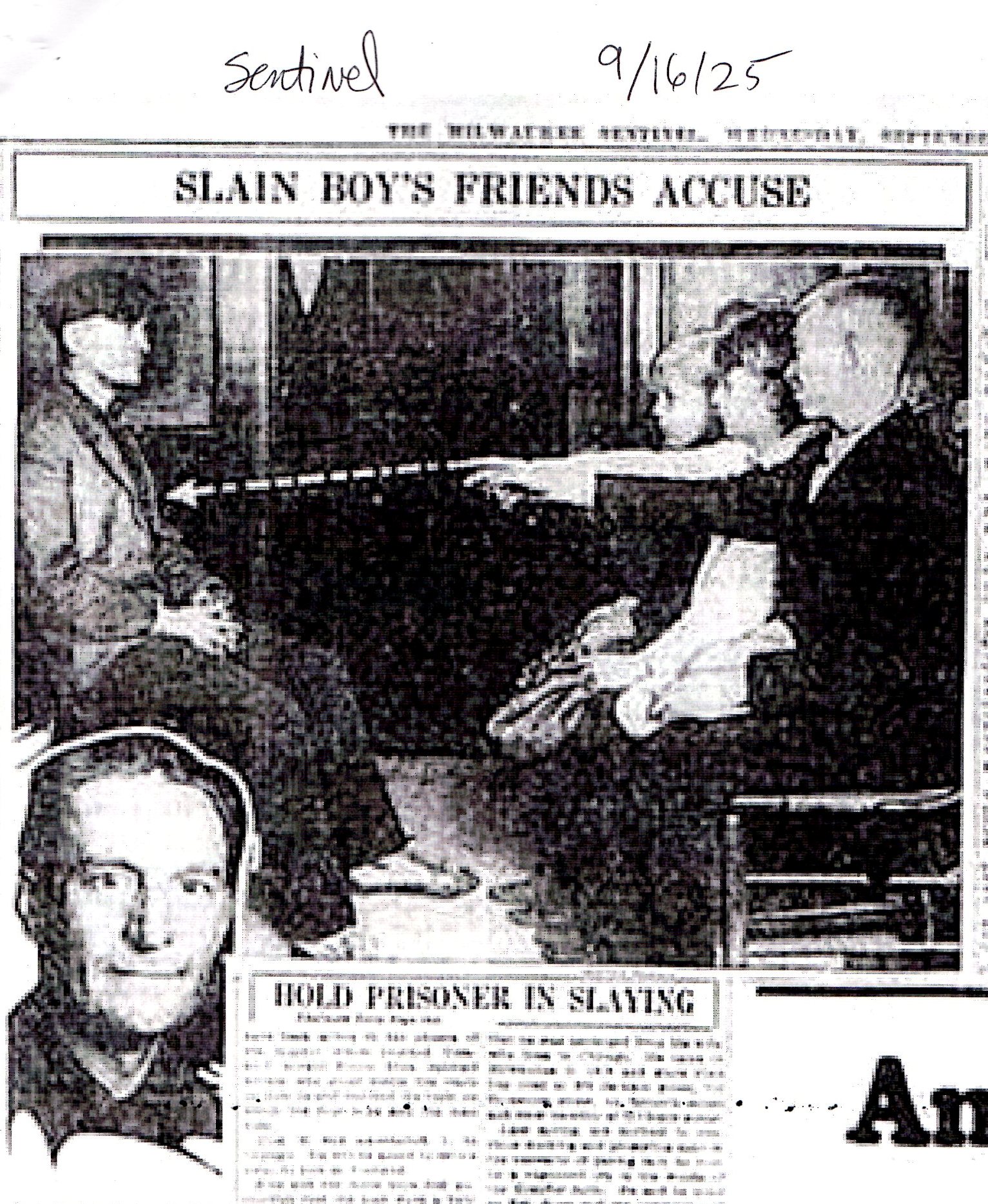 Here is an interesting photo, set up at the Wauwatosa Police Department. Buddy Schumacher’s friends (right) point at suspect Edward Vreeland. Dashed arrow provided by the Milwaukee Sentinel.