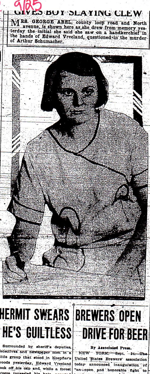 Emma Abel, Wauwatosa, who described a handkerchief similar to the one Buddy was killed by, as being in possession of Edward Vreeland. Later, Mrs. Abel said she could not positively identify the handkerchief removed from Buddy’s throat as the one she’d seen Vreeland with.