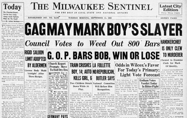 Front page of the Sept. 15, 1925 Milwaukee Sentinel reporting the fact that Buddy was killed by a handkerchief that had been shoved down his throat, suffocating him.